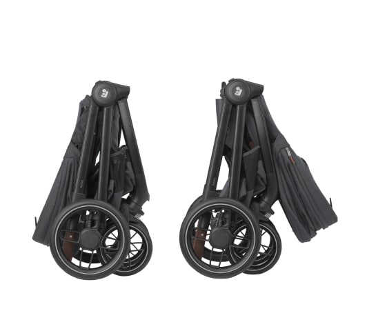 Le mécanisme intuitif de pliage en deux étapes de la poussette permet un rangement compact et facile. En mode siège, la poussette se replie dans les deux sens et forme un ensemble compact qui tient debout tout seul.